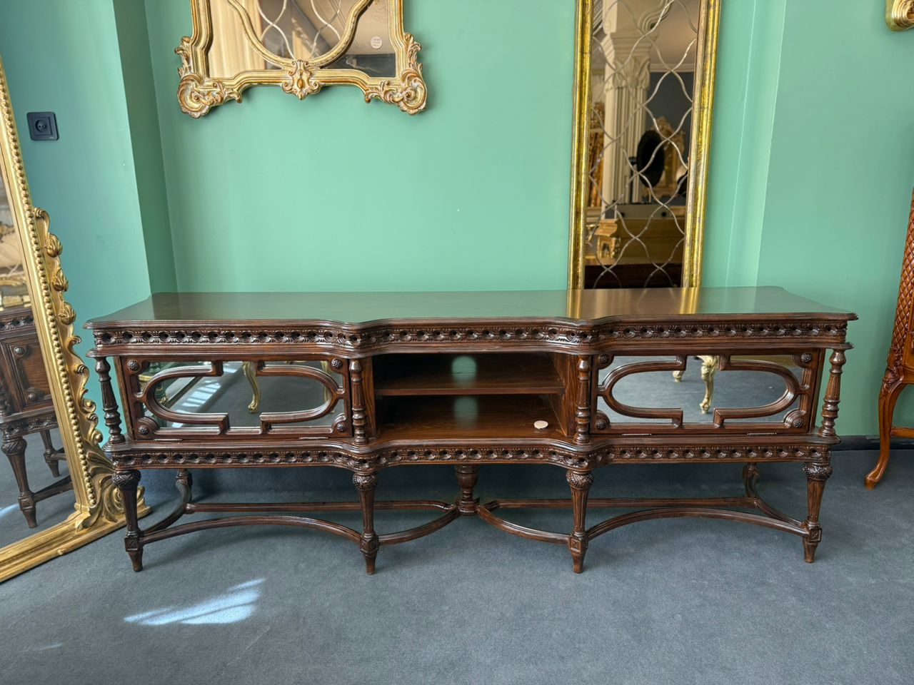 تی وی نگینی صنایع چوب رادین مدل 138 ترکیبی از هنر اصیل ایرانی و طراحی مدرن اروپایی است. این میز تلویزیون با استفاده از چوب راش باکیفیت و روکش مقاوم تولید شده و در رنگهای مختلف قابل سفارش است. طراحی منحصربهفرد پایهها، فرم متقارن بدنه و تزئینات ظریف باعث شده تا این محصول بهعنوان یکی از پرفروشترین مدلهای دکور آنتیک شناخته شود.